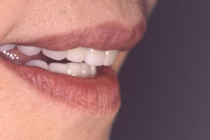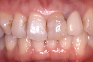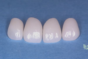 オールセラミック名称の通り、すべてセラミックを使用しているのが特徴です。金属を使用していないので、金属アレルギーなどの心配がありません。また、形によって「ラミネートベニヤ」や「インレー」と呼ばれるものもあります。 ラミネートベニヤは、表面を少しだけ削ってセラミックを貼り付けますので、元の歯を削る量が少なくて済みます。 インレーは、奥歯など部分的に詰め物をする場合に、金属の代わりにセラミックを使用します。 症例1−上の前歯4本の変色を気にして来院されました。![]() 処置前